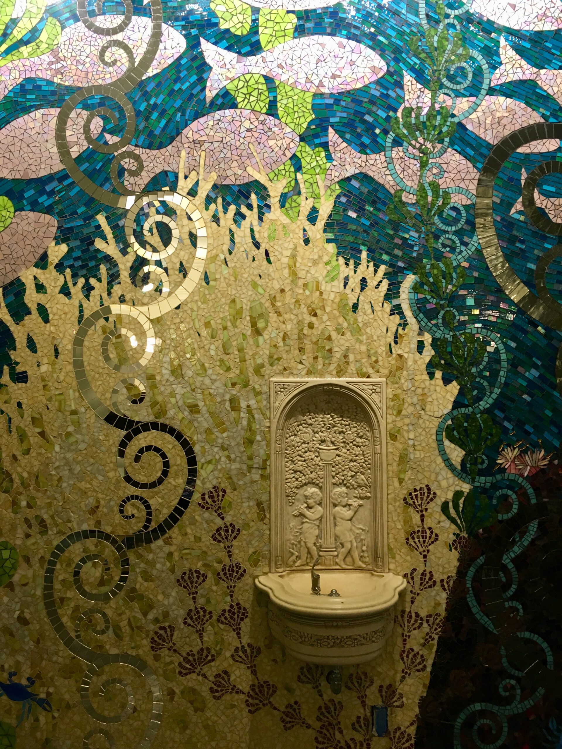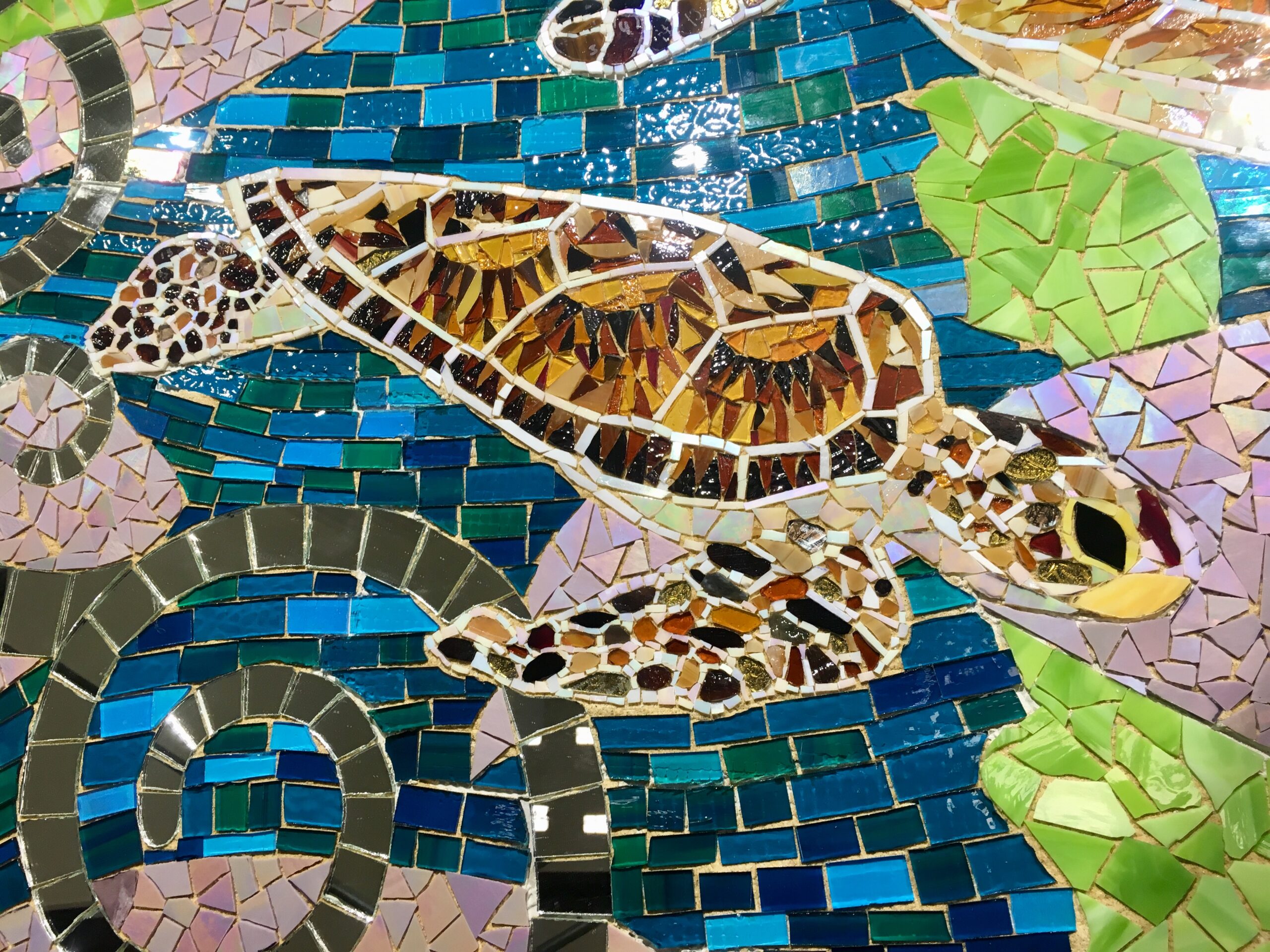 This mosaic was designed and created by Art with a Heart with the help of 400 volunteers including Enoch Pratt Free Library patrons, its staff, and Board members as well as Art with a Heart volunteers, students, staff and community members. 45,000 pieces of hand cut glass from 65 different varieties were used to create this vibrant underwater scene developed to inspire exploration, imagination and fantasy.