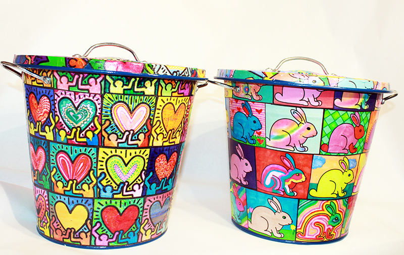 Colorful metal trash cans decorated with hand-colored images in the style of Pop Art made famous by artists like Andy Warhol.